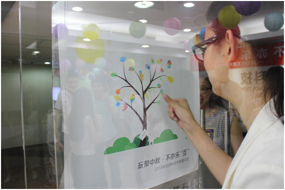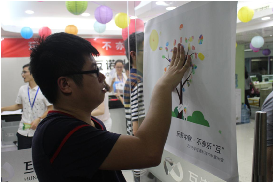 欢乐的时光总是过得很快,晚上九点,喜乐会接近尾声,同事们纷纷走到门口,用自己的手指沾上染料,为公司的手指画增添自己的一笔。很快,手指画上的树叶变得茂密,而互诺科技的这棵大树,也在同事们的手中变得愈加动人,愈加伟岸。