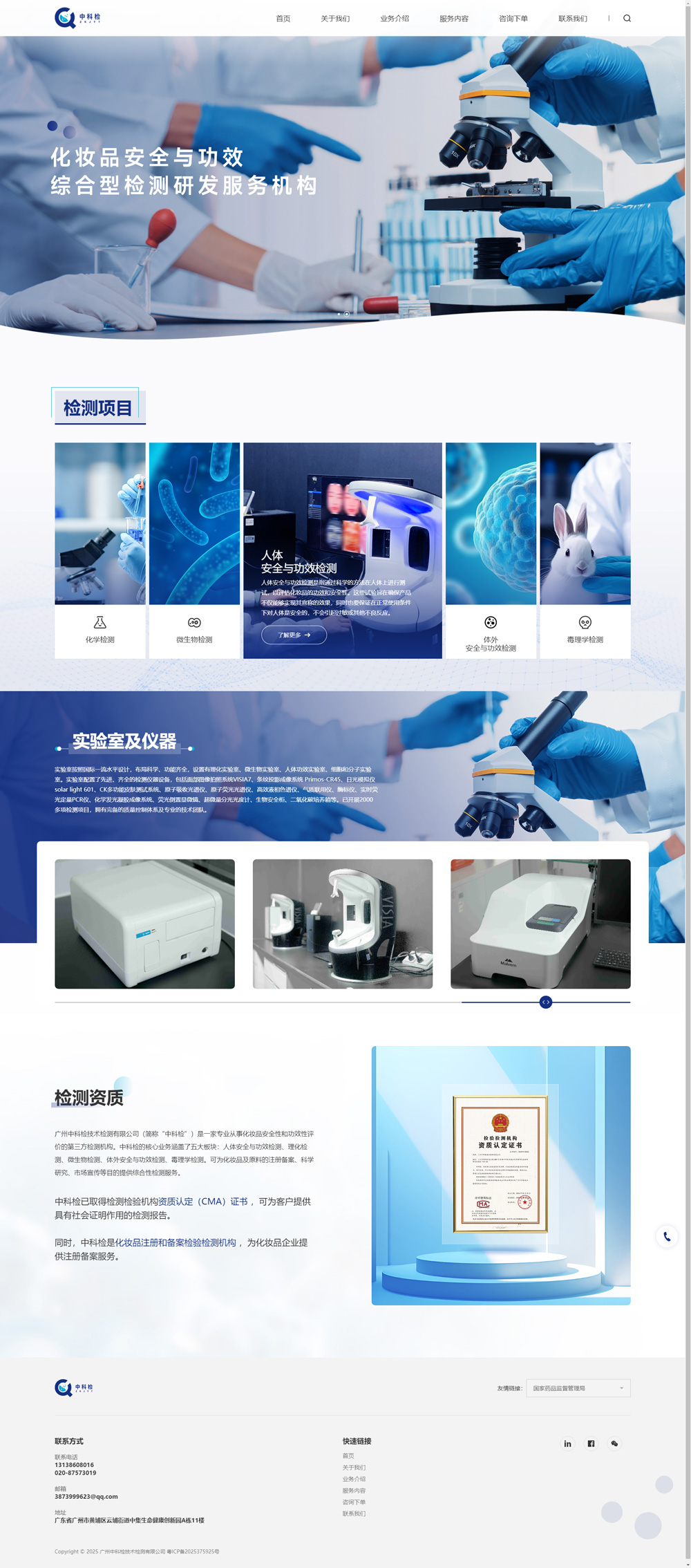 在互联网技术深度赋能各行业的当下,专业化服务机构亟需通过优质的网络平台彰显核心优势、链接目标客户。广州市互诺计算机科技有限公司(简称:互诺科技)作为成立于 2005 年的成熟整合式互联网应用服务商,凭借专业化、个性化、品牌化的网络服务能力,成功为广州中科检技术检测有限公司(简称 “中科检”)打造专属官网,助力这家化妆品检测领域的专业机构实现品牌形象升级与业务精准展示。