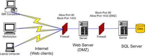 如图A所示的网络通信中,80端口的HTTP或者1443只被允许到达Web服务器。然后Web服务器通过1433端口,通过TCP协议同SQL服务器进行通信。另一种方法,是使用微软的ISA服务器作为转换代理,并允许它控制与SQL服务器的通信。